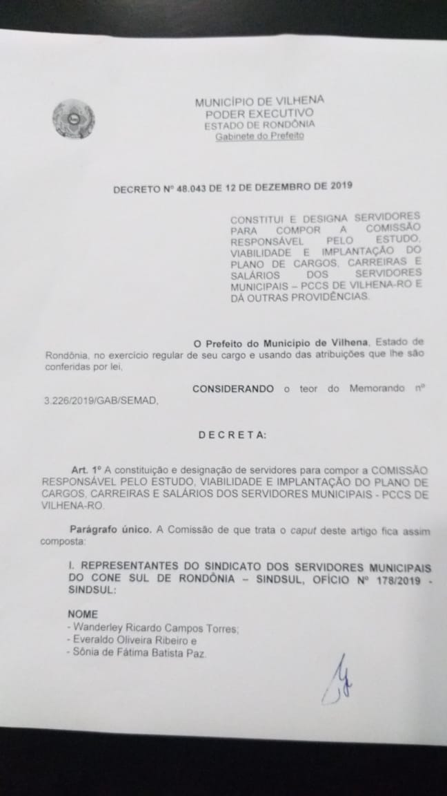 A comissão de implantação do Plano de Cargos, Carreiras e Salários (PCCs), criada no dia 12 de dezembro, já iniciou os trabalhos de estudo e debates sobre os benefícios que entrarão em vigor para os servidores efetivos da Prefeitura de Vilhena em 2020. O primeiro encontro foi realizado na sede do Sindicato dos Servidores Municipais do Cone Sul de Rondônia (Sindsul) nesta terça-feira, 17, e deu resultados positivos: a redução do período de 4 para 2 anos na mudança de referência vai passar a vigorar.