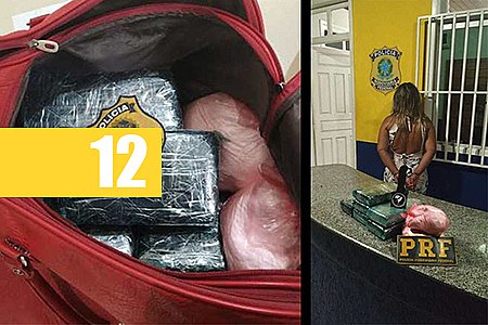 Em razão do nervosismo apresentado pela jovem, os policiais verificaram sua bagagem e localizaram dentro de uma das bolsas, oito invólucros no formato de barra e, no teste inicial, a substância foi confirmada ser cocaína.