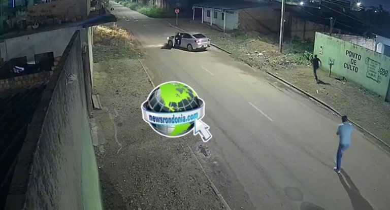Imagens de câmera de segurança registraram o momento em que um homem é surpreendido por criminosos armados e baleado na Rua Tambaqui, no bairro Lagoa, em Porto Velho.