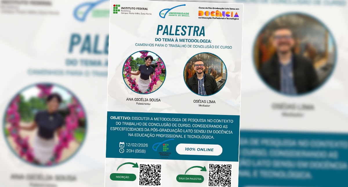 Na próxima quinta-feira, 12 de fevereiro de 2026, às 20h, horário de Brasília, o Instituto Federal de Rondônia, em parceria com a Universidade Aberta do Brasil e o curso de Pós-graduação Lato Sensu em Docência na Educação Profissional e Tecnológica, promove a palestra “Do tema à metodologia: caminhos para o Trabalho de Conclusão de Curso”. O encontro será realizado de forma totalmente online, ampliando o acesso de estudantes e professores interessados em qualificar seus projetos de pesquisa.