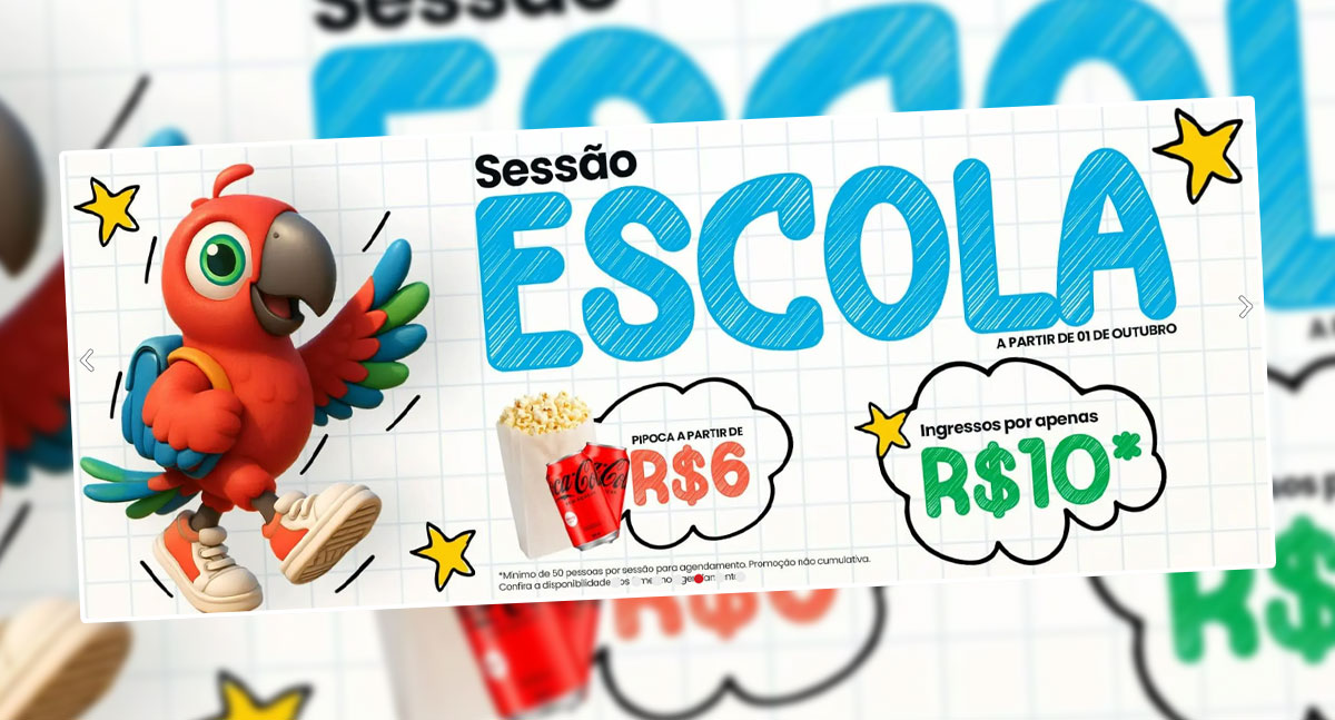 A Sessão Escola do Cine Araújo está aberta para turmas organizadas que queiram viver uma experiência completa de cinema, aprendizado e integração. O ingresso promocional custa R$ 10,00 por participante e o grupo precisa ter mínimo de 50 pagantes. O agendamento é exclusivo para escolas e deve ser feito com antecedência pelo e-mail evento@cinearaujo.com.br ou presencialmente na unidade da sua cidade, sujeito à disponibilidade de sala e horário conforme a programação local.