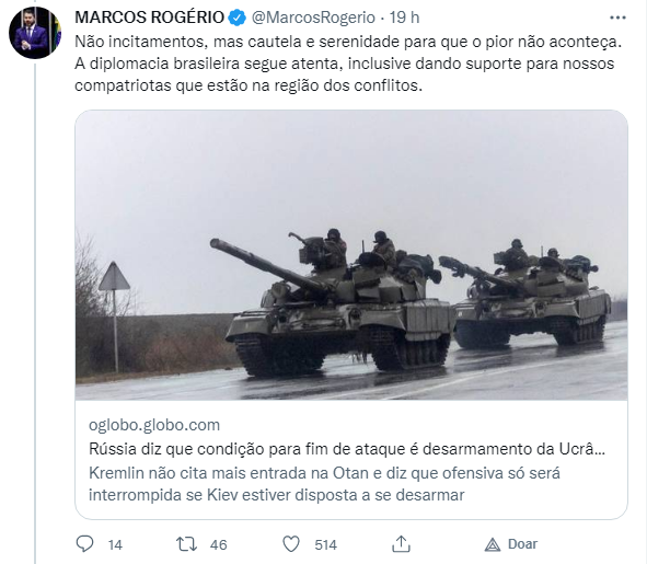 O senador Marcos Rogério (DEM) foi enquadrado por internautas sobre uma afirmação feita no Twitter de que a diplomacia brasileira “tem dado suporte aos brasileiros” que estão no meio do fogo cruzado na guerra que ocorre na Ucrânia.