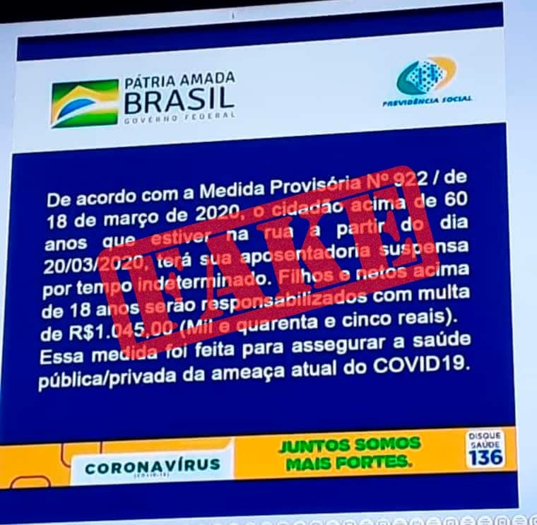 Medida provisória de Nº 922/ de 18 de março de 2020, onde determina que os idosos acima de 60 anos que saírem para as ruas a partir do dia 20/03/2020, terão suas aposentadorias suspensas por tempo indeterminado é falsa. Essa MP por sinal é do dia 28 de fevereiro e não do dia 18 de março como mencionado na medida. Além disso, no texto da proposta não existe nenhuma menção sobre penalidade aos idosos que descumprirem a quarentena.