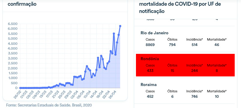 Segundo o boletim do Ministério da Saúde, Rondônia registra 15 óbitos e 433 casos confirmados de covid-19.