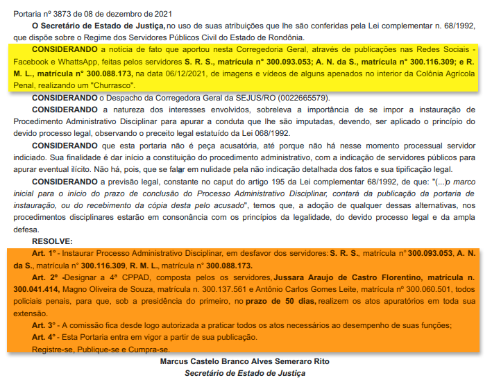 Uma portaria assinada pelo Secretário de Estado de Justiça de Rondônia, Marcus Castelo, e publicada na edição desta terça-feira (25) do Diário Oficial do Estado (DIOF) informa a abertura de Procedimento Administrativo Disciplinar contra três servidores que teriam publicado em suas respectivas rede sociais as imagens, via vídeo, de alguns apenados no interior da Colônia Agrícola Penal realizando um "churrasco” nos corredores da unidade.