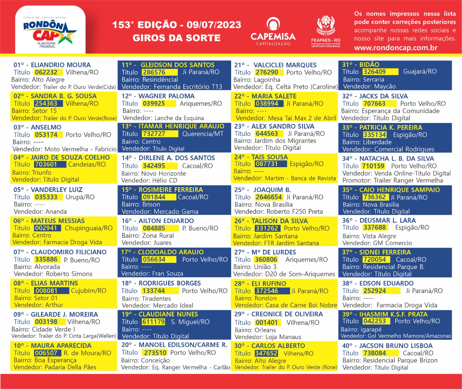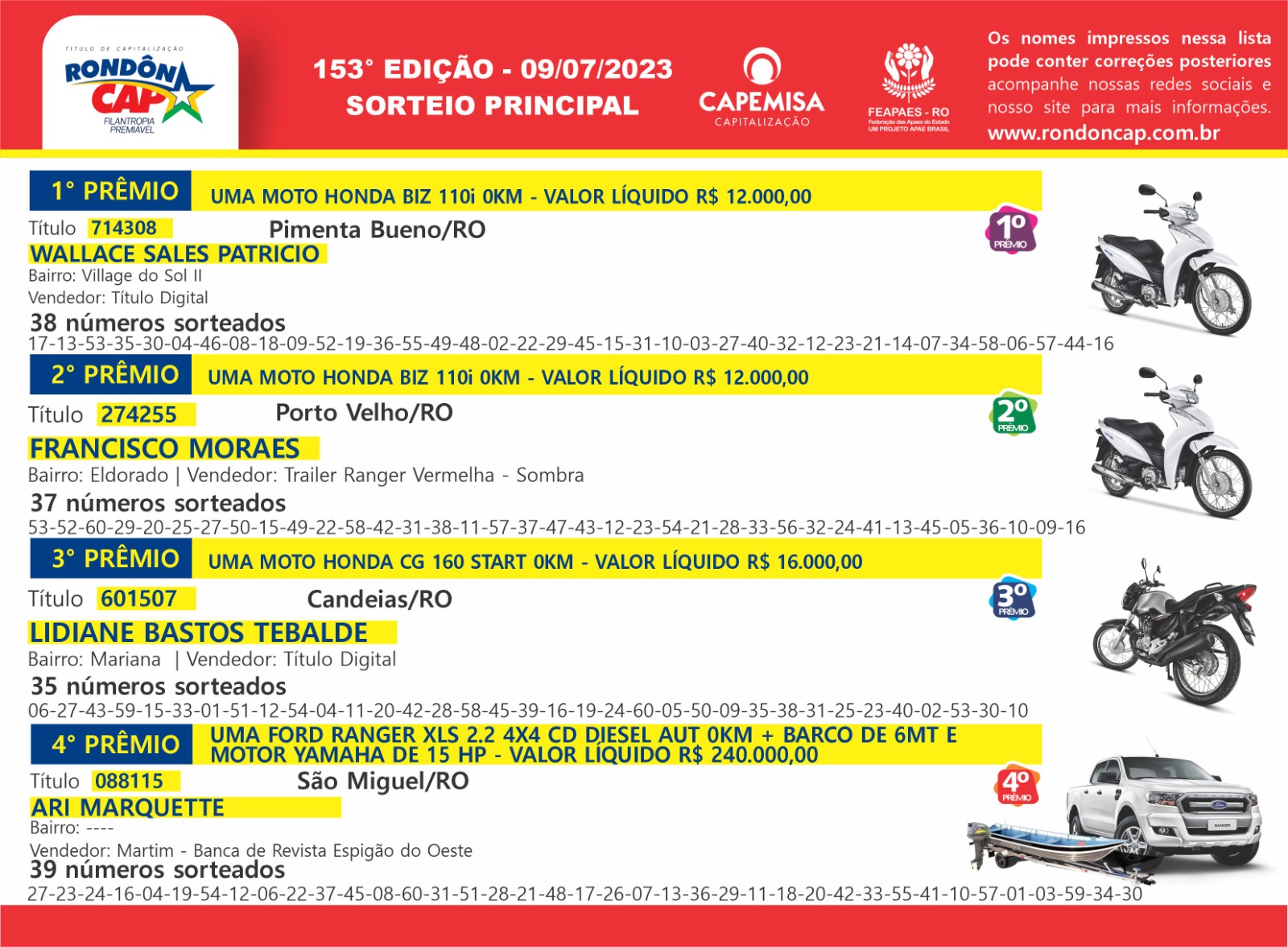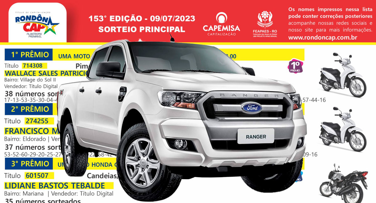 Na tarde de domingo, dia 09, o Rondôncap realizou mais um grande sorteio onde premiou vários rondonienses. Veja a relação: