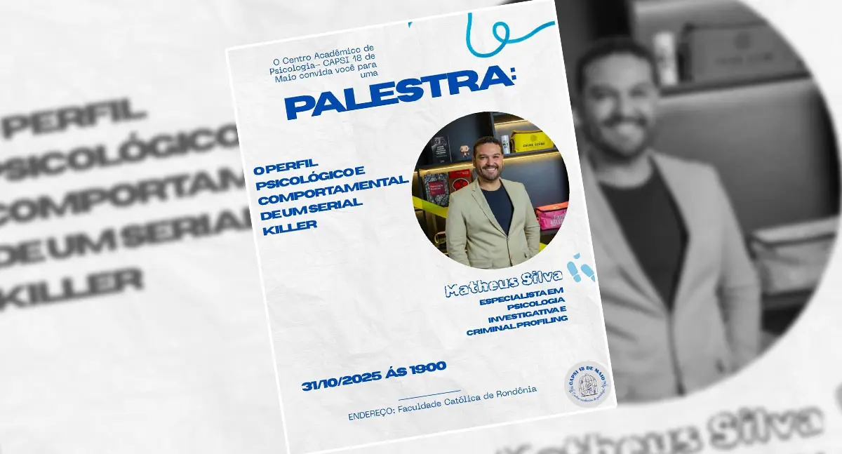 O clima de curiosidade e mistério vai tomar conta da Faculdade Católica de Rondônia no dia 31 de outubro de 2025, às 19h, com o aguardado Encerramento da Semana Acadêmica de Psicologia. O evento, promovido pelo Centro Acadêmico de Psicologia – CAPSI 18 de Maio, convida o público para uma palestra fascinante sobre “O Perfil Psicológico e Comportamental de um Serial Killer”, ministrada pelo Psicólogo Criminal Matheus Silva, especialista em Psicologia Investigativa e Criminal Profiling.