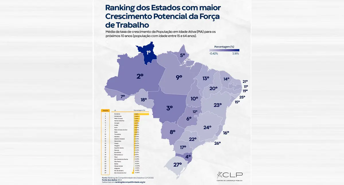 Roraima lidera o ranking nacional, ocupando a 1ª posição, com a maior taxa de crescimento da população em idade ativa do país. Logo em seguida aparece o Amazonas, em 2º lugar, reforçando o peso demográfico e econômico do estado. O Amapá surge na 5ª colocação, enquanto o Acre ocupa a 7ª posição, ambos com crescimento acima da média nacional.