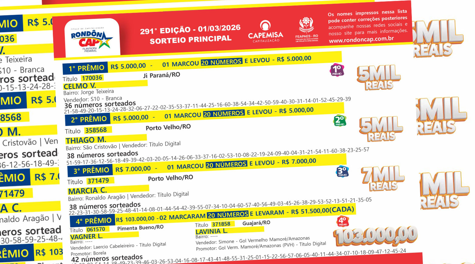 A tarde deste domingo, dia 01 de março, foi marcada por expectativa, emoção e muita comemoração com a realização da 291ª edição do RondônCAP. Como já é tradição em Rondônia, famílias acompanharam o sorteio na esperança de ouvir seus nomes e, quem sabe, começar a semana com uma grande notícia.