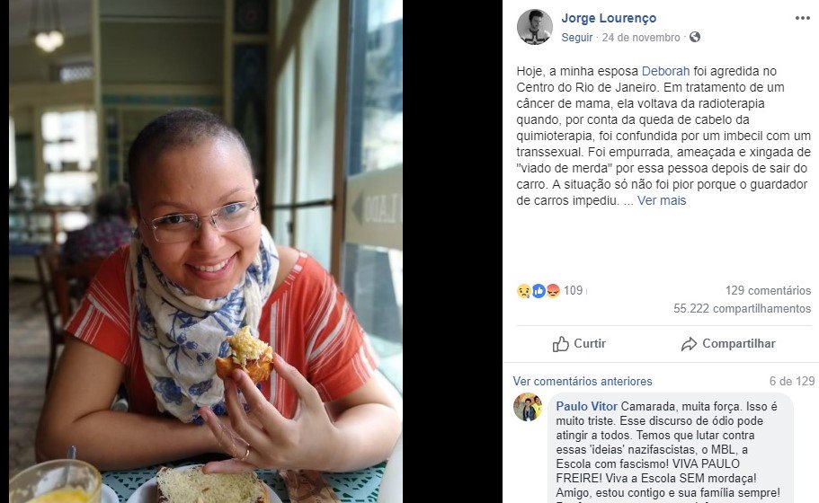“Hoje, a minha esposa, Deborah, foi agredida no Centro do Rio de Janeiro. Em tratamento de um câncer de mama, ela voltava da radioterapia quando, por conta da queda de cabelo da quimioterapia, foi confundida por um imbecil com um transexual”, diz trecho do texto.