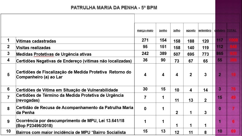 A capitã PM reconheceu que a Patrulha Maria da Penha é um instrumento novo em defesa das vítimas de violência doméstica e familiar, mas que o resultado de suas ações é animador pelos números que apresenta no atendimento direto a mulher vítima em todo Estado, e em Porto Velho especialmente, além de um conjunto de atividades como palestras e conferências que vêm sendo realizadas para meninas de escolas públicas do Estado, com orientação adequada e apoio, gerando importantes resultados neste segmento.