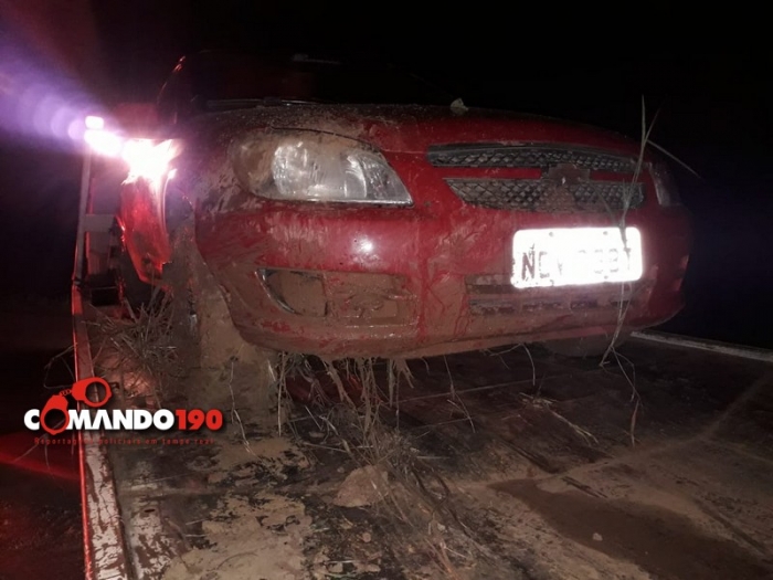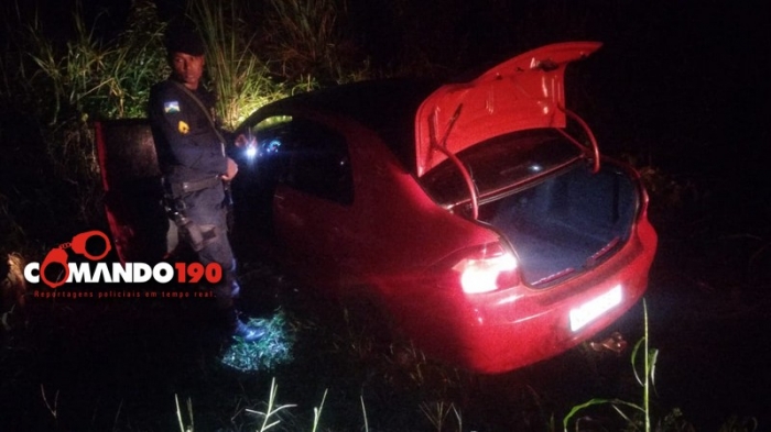 Após quase 5 KM de acompanhamento, o motorista perdeu o controle da direção e o veículo acabou caindo em uma ribanceira. Os dois ocupantes abandonaram o carro e continuaram a fuga a pé, entrando no brejo.