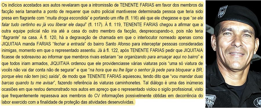 “A familiaridade entre os dois parece ser tamanha ao ponto de Jiquitaia ter mencionado em um diálogo que o tenente Farias sabia que o primeiro só estaria solto por causa da atuação do policial militar”.