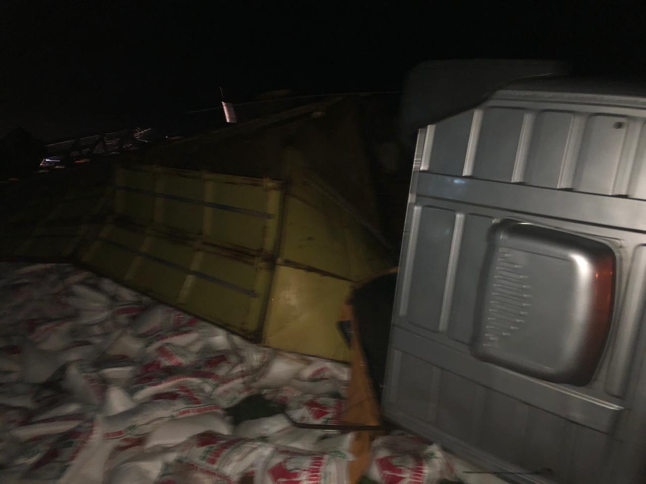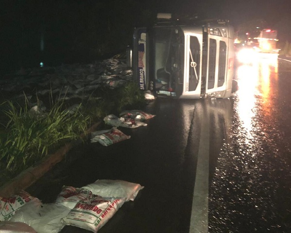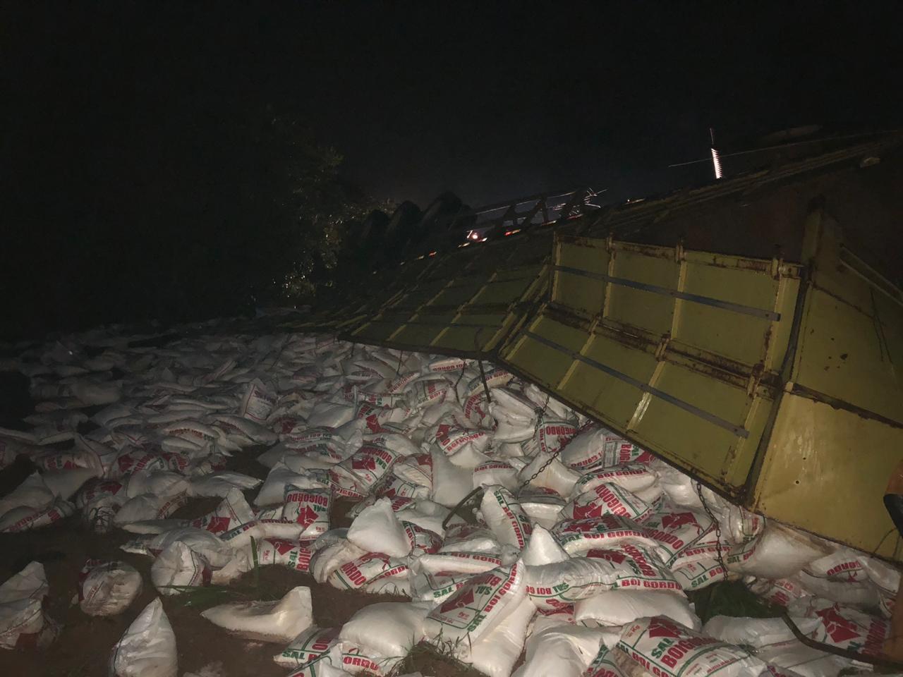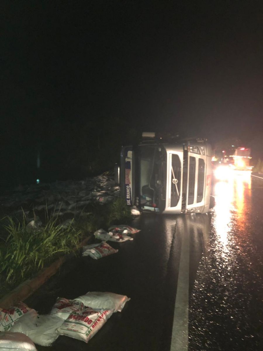 Por sorte o motorista da carreta não se feriu, e a carga de sal ficou espalhada na beira da rodovia.