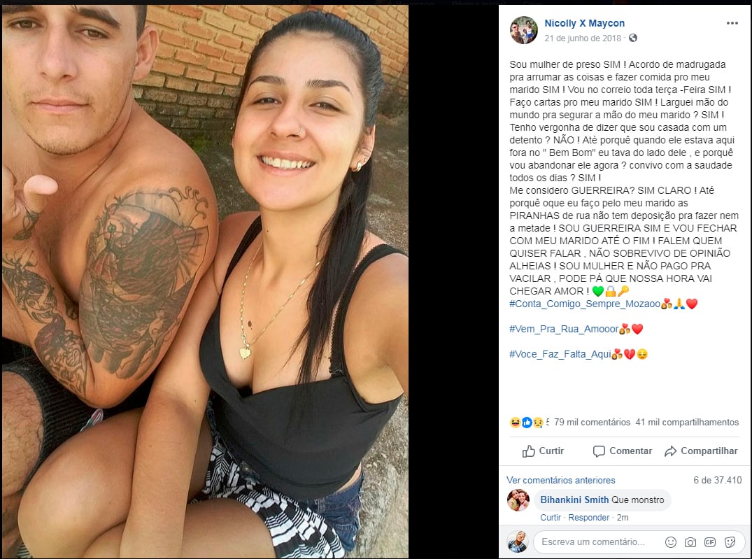Você já deve ter ouvido falar em amor bandido. Pois bem, infelizmente uma jovem identificada como Nicolly Guimarães Sapucci, de 22 anos, que ostentava nas redes sociais dizendo que era esposa de presidiário e que fazia visitas semanais ao ‘mozão’ na cadeia, além de preparar deliciosas refeições para levar ao marido, entre outras coisas que ela se orgulhava em fazer, foi brutalmente assassinada neste domingo (27).