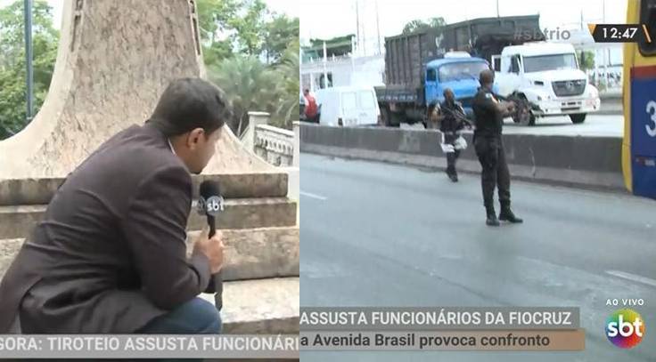 Um repórter do SBT acabou parando no meio de um tiroteio no Rio de Janeiro. O flagra foi feito durante uma reportagem ao vivo para o jornal SBT Rio. O programa com as imagens da troca de tiros foi ao ar na hora do almoço desta quarta-feira (06).