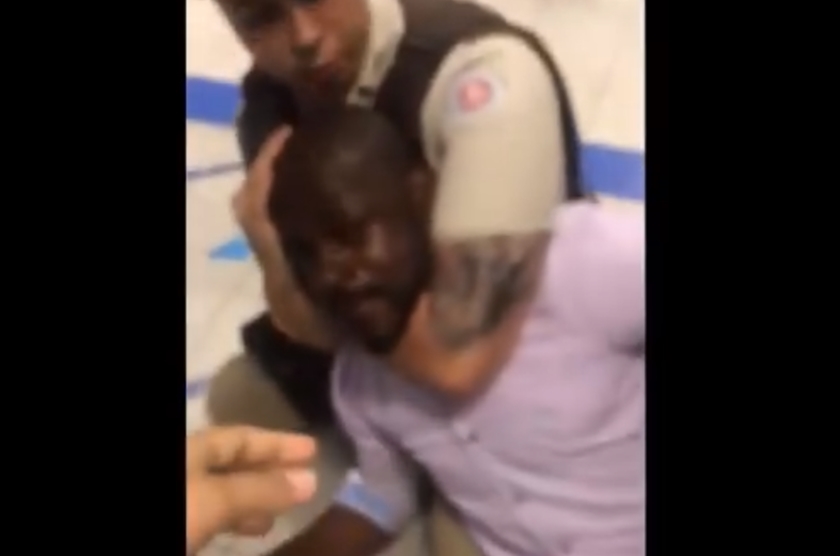 Nas imagens, o policial chamado pelo gerente da CEF aparece aplicando um golpe mata-leão em Crispim. A filha do empresário estava presente durante o ato e fez a filmagem.