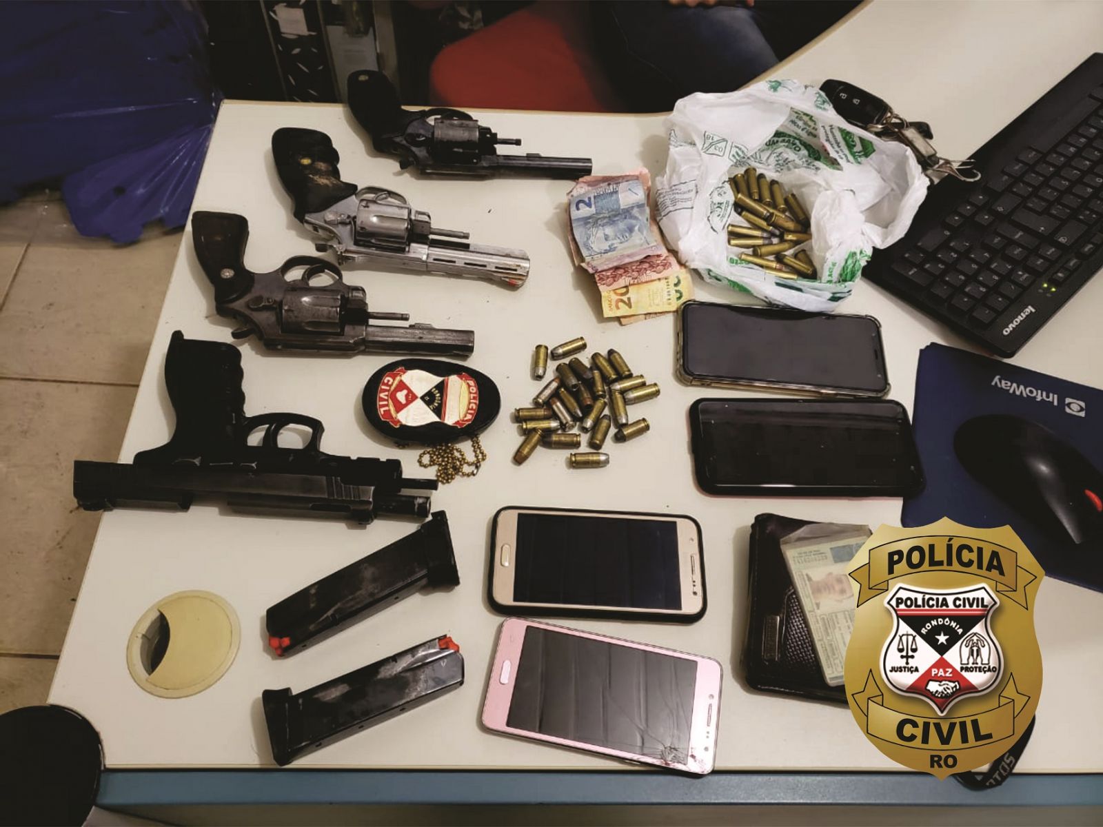 Durante diligências, os policiais lograram êxito em apreender três revólveres e uma pistola, além de munições e dinheiro. Os presos ficaram à disposição da Justiça. Eles também são suspeitos de cometer outros roubos em Candeias e na capital.
