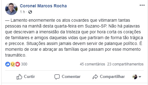 “Lamento enormemente os atos covardes que vitimaram tantas pessoas na manhã desta quarta-feira em Suzano-SP. Não há palavras que descrevam a imensidão da tristeza que por hora corta os corações de familiares e amigos daquelas vidas que partiram de forma tão trágica e precoce. Situações assim jamais devem servir de palanque político. É momento de orar e abraçar as famílias que passam por esse momento traumático”, escreveu Rocha em seu perfil no Facebook.