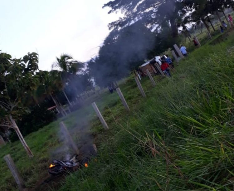 O impacto foi tão grande que a motocicleta incendiou e o veículo Fiat ocupado por uma família capotou.