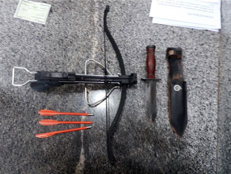 Uma besta, dardos e faca de caça são apreendidos na Secretaria de Educação com um homem que invadiu o local.