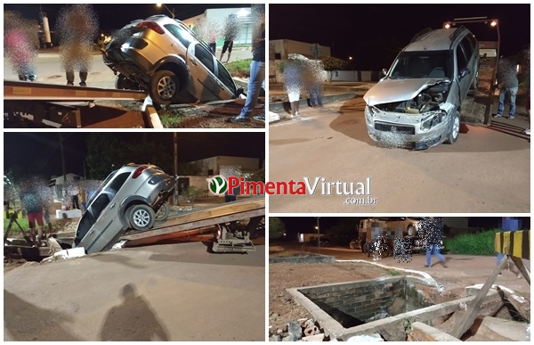Um carro ficou preso ao cair em um bueiro no bairro Vila Nova em Pimenta Bueno – RO.