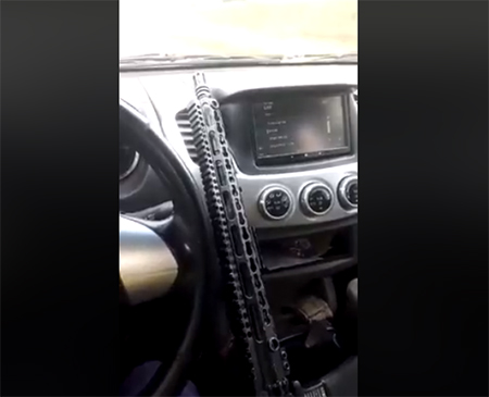 Nas imagens possivelmente feitas no interior de uma caminhonete Mitsubishi em transito pela BR 364, o suspeito exibe um fuzil e uma pistola.