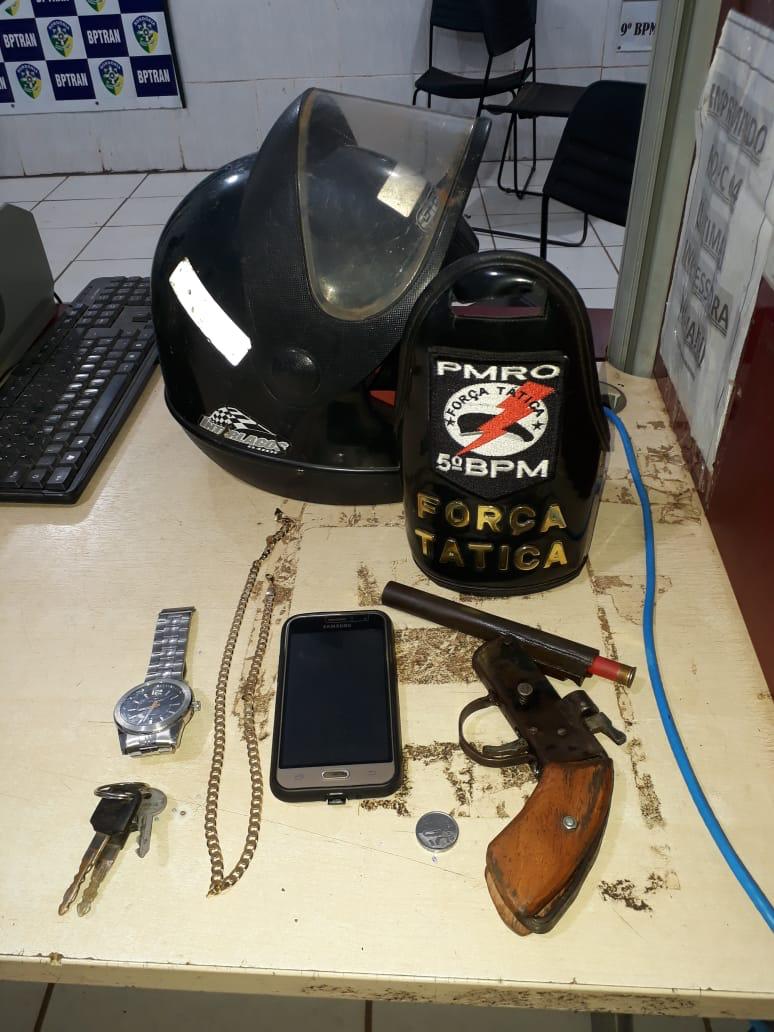 Conforme informado, os policiais avistaram o suspeito em frente uma oficina de motos e realizaram abordagem. Durante revista pessoal, foi encontrado na cintura do rapaz, um armamento de fabricação caseira com uma munição calibre 36 que já havia tentado ser disparada. Verificou-se que o rapaz estava tentando consertar uma motocicleta Honda Titan 150 de cor vermelha e placa NDD 6386. Feito pesquisa veicular, foi constatado que a moto era roubada. Um celular Samsung foi encontrado com Wendel e ao verificar os contatos, os policiais descobriram a verdadeira dona e a mulher reconheceu o preso como sendo o homem que havia roubado seu celular momentos antes.