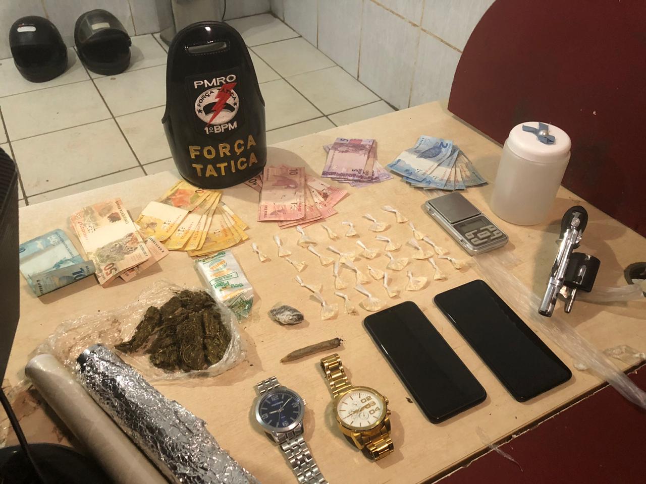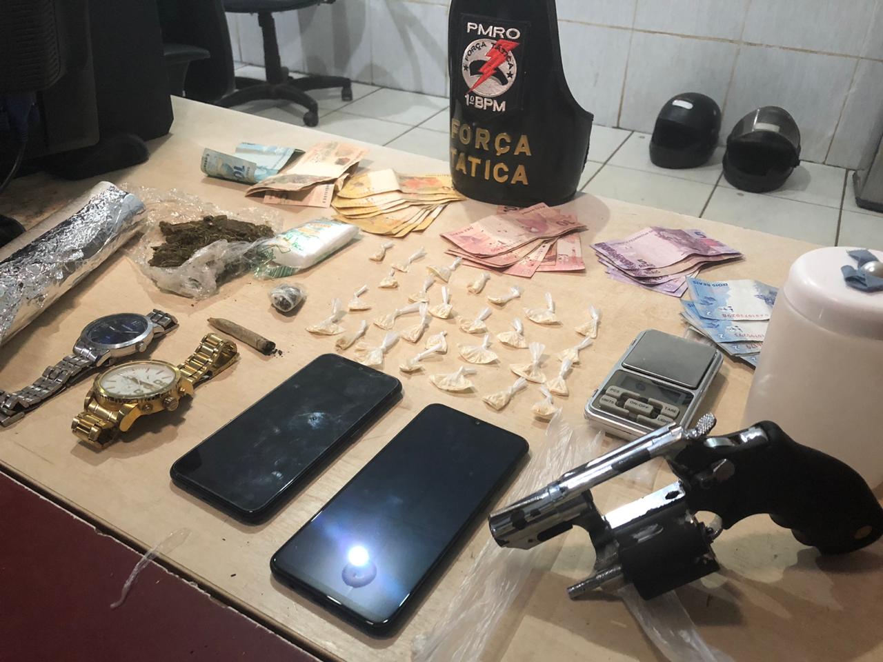 De acordo com informações dos militares, eles estavam fazendo patrulhamento de rotina quando avistaram o menor na frente da casa e este ao perceber a aproximação dos policiais, saiu correndo para dentro da casa sendo feito o acompanhamento do infrator sendo abordado e durante verificação foi localizado várias porções de droga do tipo Maconha e cocaína, além de balança de precisão, dinheiro proveniente da venda dos entorpecentes, aparelhos celulares de procedência duvidosa e um revólver calibre 38.