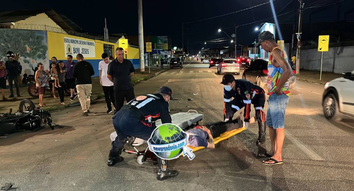 O grave acidente ocorreu na noite desta sexta-feira (22), no cruzamento da Avenida Raimundo Cantuária com a Rua Equador, no bairro Nova Porto Velho. Um jovem de aproximadamente 20 anos ficou ferido.