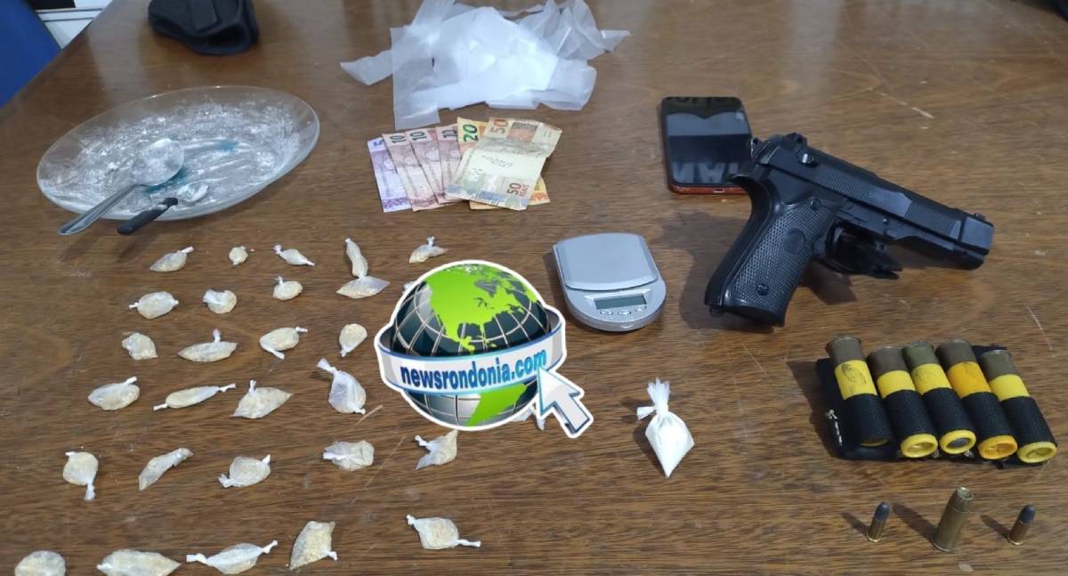 Com ele, foram encontradas 33 porções de cocaína, munições de calibres .22, .38 e .20, além de uma balança de precisão e um simulacro de pistola.