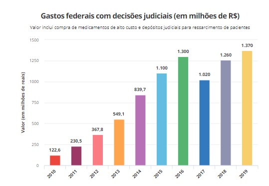 Só em 2019, o Ministério da Saúde gastou R$ 1,37 bilhão com aquisição de medicamentos e depósitos judiciais para ressarcimento de pacientes. Em dez anos, entre 2010 e 2019, as demandas custaram R$ 8,16 bilhões aos cofres federais.