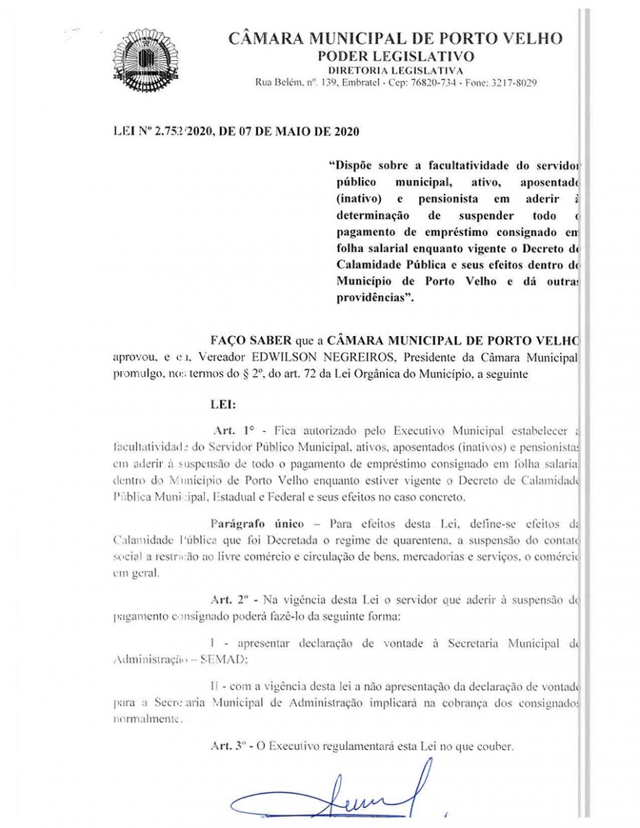 O vereador-presidente da Câmara de Vereadores propôs o Projeto de Lei que hoje se tornou disposito legal já publicado no Diário Oficial de Porto Velho desobrigando os servidores públicos do município do pagamento de empréstimos consignados.