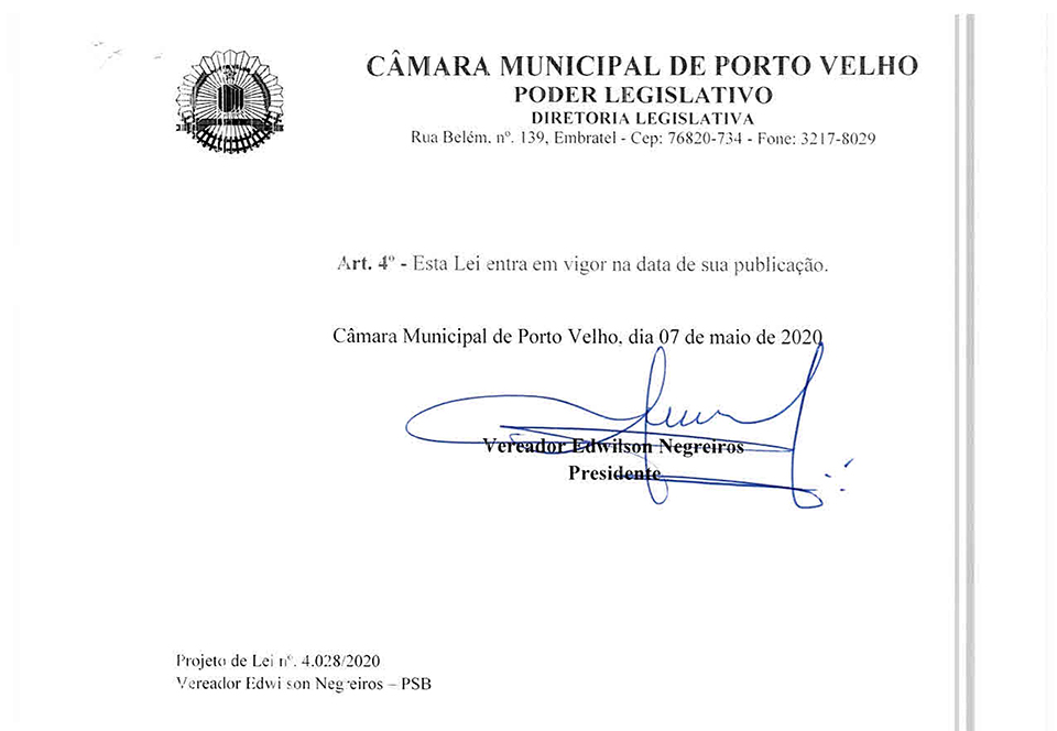 A lei concebida por Edwilson Negreiros, do PSB, leva em conta o Decreto de Calamidade Pública editado e proferido pelo prefeito Hildon Chaves, do PSDB, em decorrência da pandemia do Coronavírus (COVID-19/SARS-CoV-2).