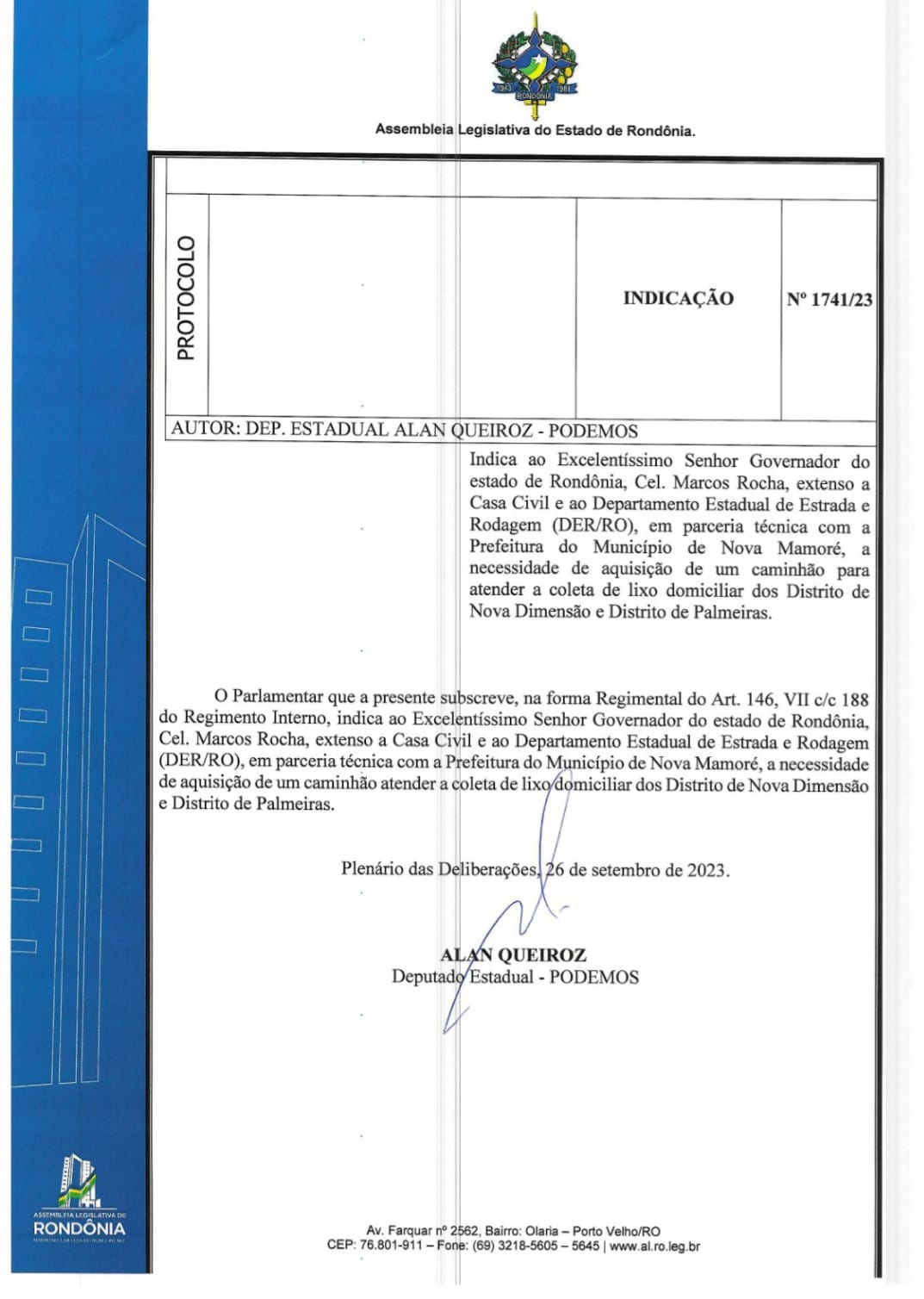 Com a finalidade de melhorar a coleta de lixo nos distritos de Nova Dimensão e Palmeiras, localizados na área rural do município de Nova Mamoré, o deputado estadual Alan Queiroz (Podemos) indicou ao Governo de Rondônia, por meio do Departamento Estadual de Estradas de Rodagem e Transportes (DER), a aquisição de um caminhão para atender a demanda de recolhimento de resíduos.