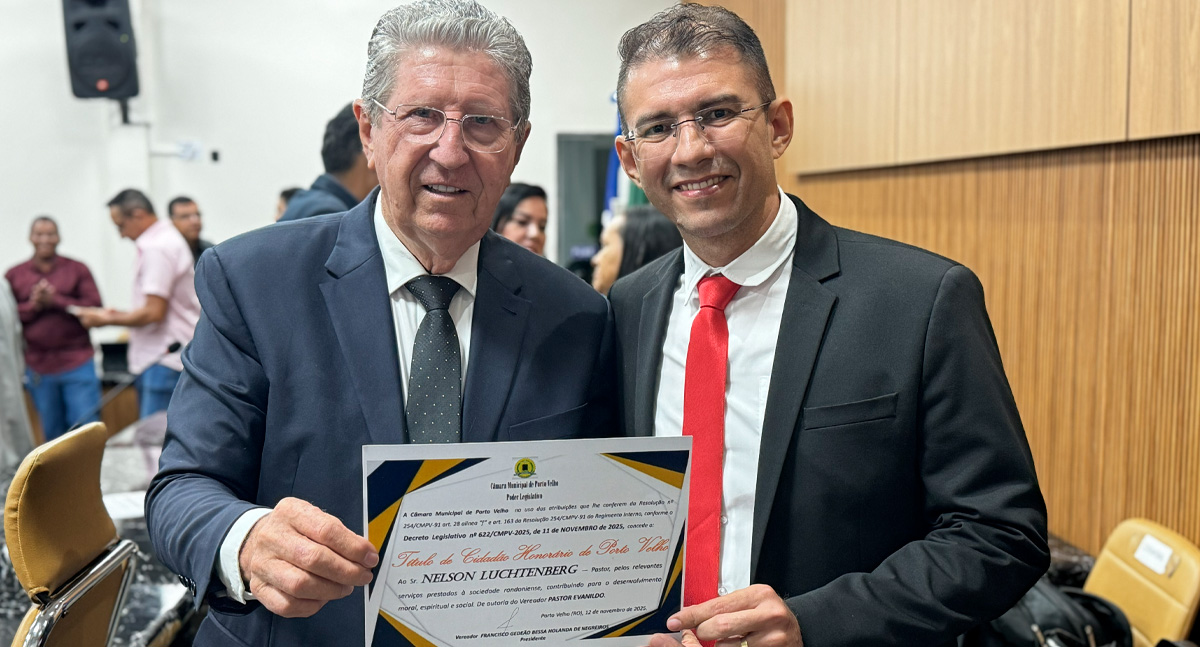 O vereador Pedro Geovar (PP) participou da sessão solene que concedeu o Título de Cidadão Honorário de Porto Velho ao Pastor Nelson Luchtenberg, uma das figuras mais respeitadas da Assembleia de Deus e referência espiritual em Rondônia. A cerimônia foi proposta e conduzida pelo vereador Pastor Ivanildo e contou com presença de autoridades municipais, lideranças religiosas e membros da comunidade evangélica.