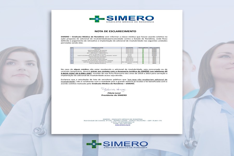O Simero ressalta que, caso algum médico, seja concursado ou de contrato temporário, não esteja recebendo o adicional de insalubridade, é necessário entrar em contato com a Assessoria Jurídica do sindicato pelos telefones (69) 98418-1220 ou no (69) 99981-3387, munido de sua ficha financeira dos anos de 2019 a 2023 para correção e implantação do adicional de insalubridade, caso seja devido.