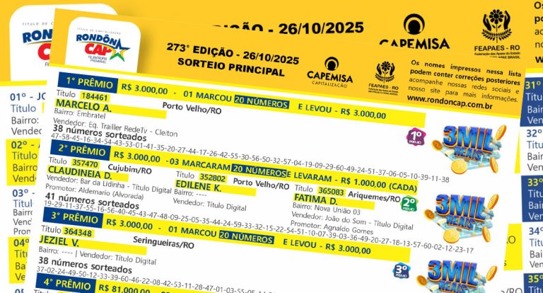 L Atualizado em 27/10/2025 às 09:13 RondônCAP sorteia R$ 110 mil em prêmios e traz 65 meses de salário extra pagos à vista no 4 Prêmio do próximo domingo Prêmios já têm vencedores, e a próxima edição traz 98 mil reais pagos à vista; confira na íntegra