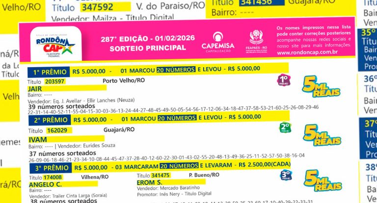L Publicado em 1/02/2026 às 21:17 RondônCAP: Sorteio já aconteceu e divulga ganhadores da 287ª edição Resultado do sorteio realizado em 01 de fevereiro de 2026 premia moradores de Porto Velho, Guajará, Vilhena, Cacoal, Jaru e outros municípios de Rondônia.