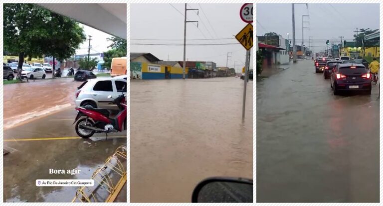 Vídeos recebidos mostram ruas alagadas, incluindo as avenidas Rio de Janeiro com Guaporé e Raimundo Cantuária, além de outros pontos críticos na cidade.