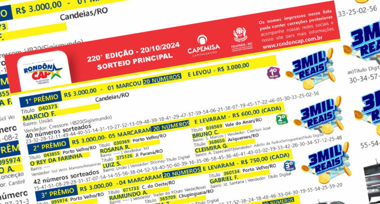 L Atualizado em 21/10/2024 às 09:45 RondônCap sorteia 100 mil reais em prêmios no último domingo Fiat Argo vai para morador de Porto Velho e 40 Giros da Sorte entregam prêmios de 500 reais cada