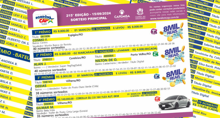 L Atualizado em 16/09/2024 às 10:17 RondônCap: Confira os ganhadores do sorteio de domingo, dia 15 Foram distribuídos mais de 200 mil reais em prêmios.