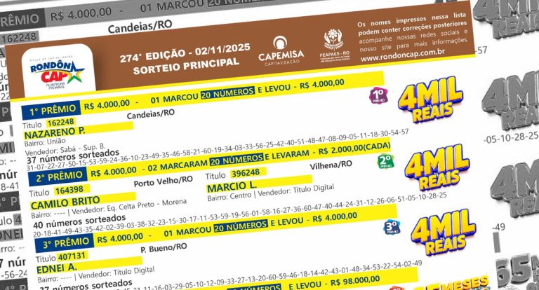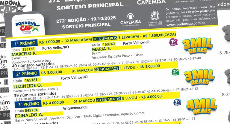 Sorteio do RondonCAP já foi realizado, e vem aí o Especial de Novembro com 220 mil no Quinto Prêmio!