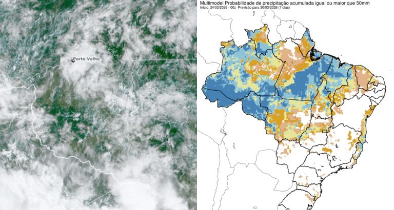 Previsão do Inmet indica chuvas intensas em Rondônia, com rajadas de vento e descargas elétricas, especialmente em Porto Velho e regiões norte e noroeste do estado.
